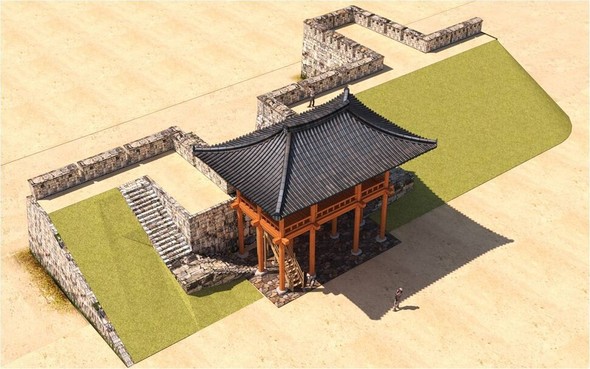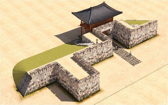 このような曲折を経た北門は、復元審議の過程で特異な根拠を提示したことが高く評価された。最近の発掘で、1597年8月の南原城の戦いの直前に明の将軍・楊元が城郭の補強のために急きょおこなった増築の跡がみつかったことが、まず注目された。南原邑城はもともと典型的な方形の平城で、中宗(チュンジョ)治世の1530年代に築城され、維持されてきた。丁酉再乱が勃発し倭軍が攻めてくることが予想されたため、水堀を掘って羊馬墻(第1の防御壁)を積みあげ、もともとの石垣をかさ上げしたという記録が残っている。実際に2020年の発掘調査では、倭軍の集中攻撃が予想される北門の進入路に設けられた虎口の実体が確認された。邑城の城門の戦時補強の跡として、国内で唯一確認された事例だ。