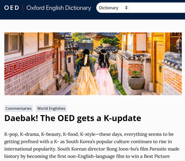 OEDは、韓国語や韓国文化から派生したか、それらに起源を持つ新しい英単語について、「K-ポップ、K-ドラマ、K-ビューティー、K-フード、K-スタイル。最近は韓国の大衆文化の国際的人気が高まり続けていることで、あらゆるものに『K-』という接頭語がついているようだ」と説明している。