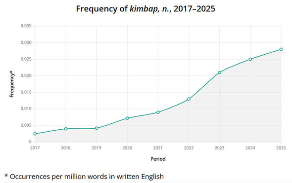 「kimbap」が英文に登場する頻度は100万単語当たり0.01回程度だ。OEDが2017年から主要オンラインニュースメディアのコーパス(言語資料を集積したもの)から抽出した結果だ。2022年以降、出現頻度が急増し、今年は0.03回に迫っている。