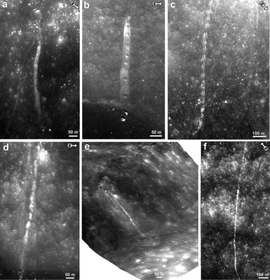 大きさは最大で数百メートル、重さは最大でトン単位に達するこれらの岩石は、絶壁の斜面に沿って転がり落ちた際にほこりを舞い上げ、表面に落下経路に沿った鮮明な縞状の痕跡を残した。