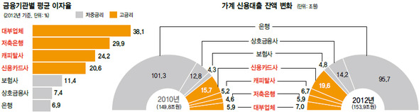 高金利金融機関の貸付規模は小さかったが、利息の額は非常に大きかった。家計信用貸付により生じた利息18兆1000億ウォンの内、高金利金融機関の利子が10兆ウォンと半分を越えた。カード会社が4兆1000億ウォンで最も多く、貸金業も2兆6000億ウォンにも達した。反面、全信用貸出の4分の3を占める低・中金利金融機関の利子は8兆1000億ウォンと半分に至らなかった。銀行が6兆6000億ウォン、相互金融社が1兆ウォンに達した。