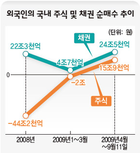 14日金融監督院の集計によれば、外国人らは昨年国内株式市場(KOSPI,KOSDAC,上場指数ファンド)で45兆2000億ウォン分を売り、今年に入っても3月末までは2兆ウォン分を売り越した。しかし4月以後は方向を変え9月11日までに15兆9000億ウォン分を買い越した。KOSPI市場だけについてみれば、4月以後の買い越し規模が21兆6000億ウォン分に達した。