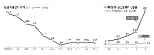 為替レート防御よりさらに至急なのは物価騰勢だ。物価はすでに赤信号がついた。先月の消費者物価指数は昨年同期に比べ3.6%、生活物価指数は4.1% 急騰した。庶民の食卓物価はさらに深刻だ。韓銀資料によれば、農産物価格上昇率は去る8月の12.3%に続き、9月には32.7%まで沸騰した。これに対し、キム総裁は 「今月の農産物価格上昇は気候変化による予想不能なことであり、短期間に終わるものと見られる」とし「現在の物価上昇率が3.6%だが、このような外部衝撃を考慮すれば2.9%にとどまっている」と話した。