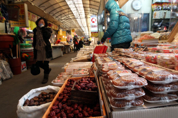 ←ソル(旧正月)連休を控えた28日昼、ソウル、西大門区、霊泉市場に買い物しに出てきた市民が、祭壇に上げる栗、ナツメ、薬菓など法事用品店の前を通りすぎている。 キム・テヒョン記者 xogud555@hani.co.kr