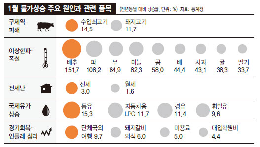 政府が今年、前面に掲げた経済運用目標は ‘5%成長-3%物価’ であった。だが、1月から物価上昇率が4%を越え、こういう基調が少なくとも3月までは続くと予想され、政府の物価目標は事実上 川を渡ったと分析されている。 政府はひとまず公式的には ‘3%’ 目標を修正しないという立場だが、当初予想より物価上昇率が上がる可能性は認めた。 ユン・ジョンウォン企画財政部経済政策局長は去る1日、ブリーフィングで「政府は1月に3.8%程度を予想したが、寒波・口蹄疫などで4%を越えた」 として「年平均物価上昇率が(当初予想より)やや上回ると考える」と話した。 政府の ‘3%物価上昇率’ は昨年末発表当時から無理な目標という批判を受けた経緯がある。