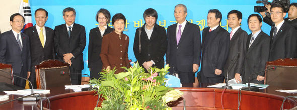 ←朴槿恵 ハンナラ党非常対策委員長(左から5人目)と委員が27日午後、ソウル、汝矣島(ヨイド)の党事務所で開かれた非常対策委員会の初会議に先立ちポーズを取っている。 左からイ・ジュヨン政策委議長、ファン・ウヨ院内代表、イ・サンドン中央(チュンアン)大教授、イ・ヤンヒ成均館(ソンギュングァン)大教授、朴委員長、イ・ジュンソク クラセスタジオ代表、キム・ジョンイン前大統領府経済首席、チョ・トンソン ソウル大教授、チョ・ヒョンジョン ビットコンピュータ代表、チュ・グァンドク議員、キム・セヨン議員。 イ・ジョンウ先任記者 woo@hani.co.kr