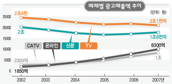 シン・デソプ前東義大教授は「中間広告を開放すれば地上波放送広告は8%拡大(2007年売り上げ基準1680億ウォン)効果が出るが、その拡大分は新聞から抜け出ることになり、ケーブルやインターネットからは抜け出さない」として「新規広告増加分は既存広告費から移るだろう」と分析した。実際広告市場は2002年以後、‘オールドメディア衰退,ニューメディア躍進’と要約される。2002~2007年の間に地上波広告は2兆4千億ウォンから2兆1千億ウォンに、新聞は2兆ウォンから1兆8千億に減った。反面ケーブルは2300億ウォンから8300億ウォンに3.5倍、インターネットは1850億ウォンから1兆ウォンに5.5倍も急増した。地上波と新聞から抜け出た金額と全体広告成長分がニューメディアに吸収されたのだ。