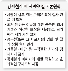 人権委はこの日「適切な住居生活を享受する権利を深刻に侵害しかねない強制撤去は原則的に禁止されるべきで、避けられない場合にも最小範囲で基本原則を守り極めて例外的にのみ認められなければならないと判断した」とその背景を明らかにした。人権委が提示した基本原則は△十分な交渉機会と適切な補償提供△公務員の立会いおよび徹底した管理△居住民退去後の撤去△被害者に対する効果的救済などだ。 (表)