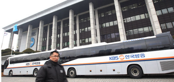 ←韓国放送側が6日労組の全面ストライキ出征式を阻むため本館前階段に駐車させたバス. 写真イ・ジョンア記者