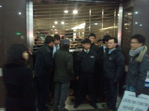 ←韓国放送が6日新労組のストライキ出征式を取材しようとしていた記者たちの出入りを統制している。(出処.@kbsunion)