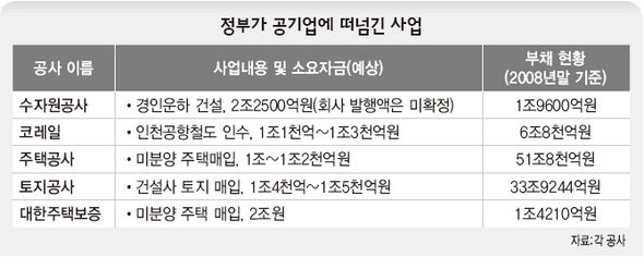 土地公社と住宅公社は ‘泣いて芥子を食べる’ 式で建設業界支援に出ている。土地公社は昨年10月と今年初めの二度にわたり建設会社の保有土地を買いとるために各々3838億ウォンと3504億ウォンを使った。5月には7000億ウォンをかけて建設会社の土地をまた買い入れる。土地公社はすでに販売契約を結んだ土地代金まで景気悪化にきちんと入ってこない状況であり、建設会社の土地を買い入れることだけに数千億ウォンを使い資金事情が悪化した。