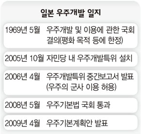 宇宙の軍事的利用を具体化したのも今回の計画の特徴だ。北韓のロケット発射を契機に発射時の火炎探知が可能な‘早期警戒衛星’導入を検討すると初めて明確に言及した。日本は1969年に宇宙の開発と利用を平和目的に限定する決議を採択した後、これを守ってきたが昨年5月宇宙基本法を与野党合意で国会通過させ、宇宙を軍事目的で利用できる道を開いた。