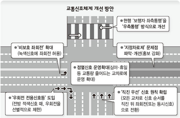 現行 ‘非保護左折’ を拡大し3車線以下の交差点では前方緑色信号の時にはこれを原則的に許すことにした。左折車両と反対側直進車両の衝突危険を減らすために都心制限速度を時速50kmに下げる計画だ。現在、主要先進国は緑色信号に左折を許し ‘南北直進→東西直進’の2段階方式を用いており信号周期が短い。反面、我が国は別途の左折信号を置く‘南北直進→東西左折→東西直進→南北左折’の4段階方式なので信号周期が長いという短所がある。