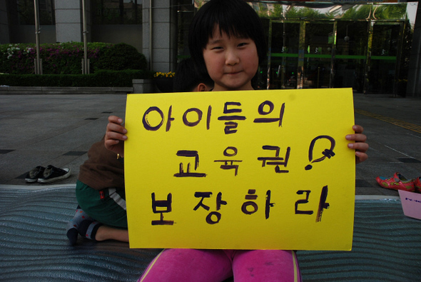 ←ソウル,松坡区,蟻の村の‘松坡夢の木’等の放課後勉強部屋の教師と学生たちが先月29日、SH公社の前で勉強部屋移住対策を要求して開いた集会で ‘松坡夢の木’ のある子供が手立て札を持っている。 写真提供 ‘松坡夢の木’