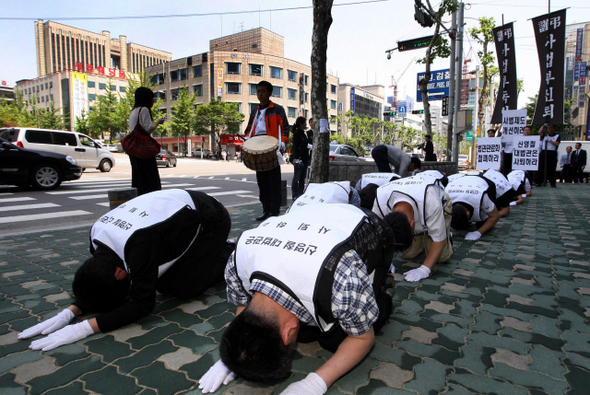 ←裁判所公務員労組組合員が18日午後ソウル,瑞草洞,ソウル中央地方法院前歩道で 「司法府構成員としてシン・ヨンチョル最高裁判事事態に対して責任感を感じる」としてシン最高裁判事の辞退を要求する三歩一拜をしている。 シン・ソヨン記者viator@hani.co.kr