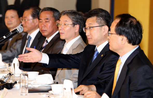 ←ホン・ヤンホ統一部次官(右側2番目)が開城工業団地法規および契約と関連して、企業等の意見を取りまとめるために18日ソウル,鍾路区AWコンベンションセンターで開かれた開城工業団地入居企業代表懇談会に参加し席を薦めている。 タク・ギヒョン選任記者khtak@hani.co.kr