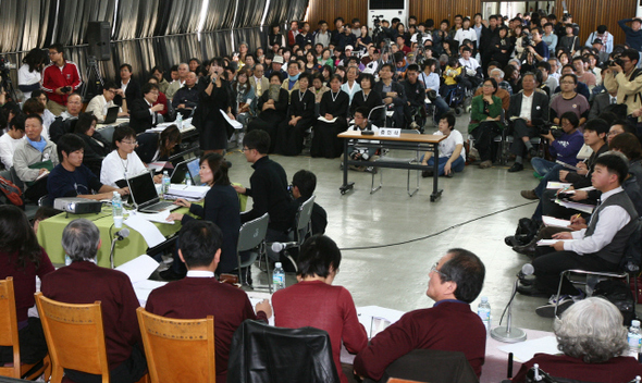 18日午後1時、ソウル,中区の明洞カトリック会館講堂では‘龍山撤去民死亡事件国民法廷’が開かれた。現在ソウル中央地裁で1審が進行中のこの事件の裁判が検察の一部捜査記録公開拒否などで不公正に進行されるほかはないと考えた市民たちが直接立ち上がった。