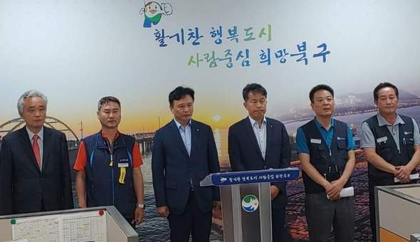 イ・ドングォン蔚山北区長とユン・ジョンオ前区長(左から3、4番目)が今月25日、記者会見を開き、求償金問題と関連した合意内容を発表している=金属労組現代自動車支部提供//ハンギョレ新聞社