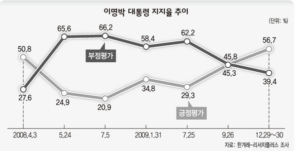こういう ‘情け深い’ 評価はイ大統領の親庶民・中道実用路線と共に経済回復,年末のアラブ首長国連邦原子力発電所受注など大規模な成果に対する国民の評価が反映されたものと分析される。 パク・ソンミン ‘政治コンサルティング ミン’ 代表は「イ大統領の高い支持率は主要20ヶ国首脳会議誘致,アラブ首長国連邦原子力発電所受注などで国民の ‘コリア ブランド’ に対する自負心を高め、他方では中小商人らとの出会いなど親庶民行動を継続した結果」と分析した。