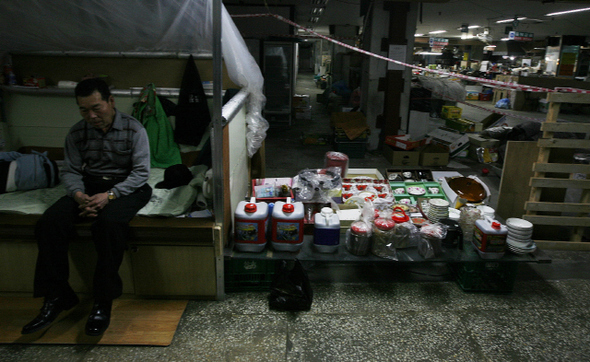 ←再建築が進行中のソウル,九老区,高尺ショッピングセンターで5日午後、一人の商人が自分の店にぼんやりと座っている。商店街の灯りが大部分消えていて周辺がかなり暗い。 パク・ジョンシク記者 anaki@hani.co.kr