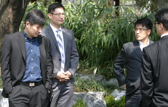 ←国防部のいわゆる‘不穏書籍’指定行為が不当だとし、憲法訴訟を提起し罷免された軍法務官パク・ジウン(左側から),シン・スンス,チ・ヨンジュン氏が23日午後、ソウル,瑞草洞のソウル行政法院で判決が下され複雑で息苦しい表情を見せている。 イ・ジョンチャン先任記者 rhee@hani.co.kr