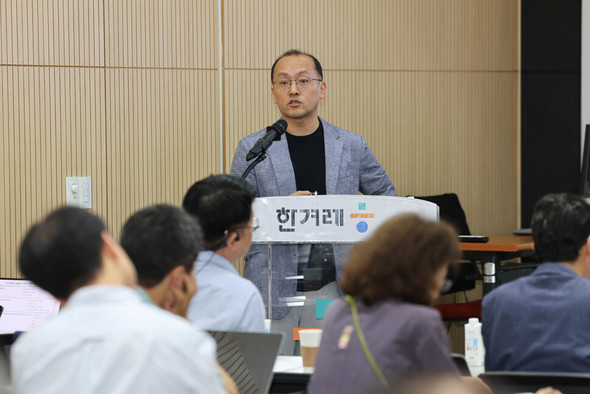 延世大学のチェ・ヨンジュン教授が6月27日午後、ハンギョレ新聞社の青巌ホールで開かれたフォーラム「韓国社会・政治の極端化をめぐる診断と展望」で、「韓国社会・政治の極右性向を読む:世代別性向と社会的要因」をテーマに基調発表を行っている=キム・ヨンウォン記者//ハンギョレ新聞社