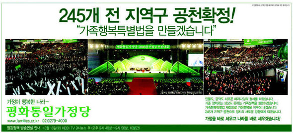 2008年3月13日付の主要日刊紙に、平和統一家庭党の名義で広告が一斉に掲載された。4月9日に実施の第18代総選挙の全選挙区に平和統一家庭党の候補を擁立するという内容だった。「家庭を正しく立て直し、国を正しく立て直す」と主張した。