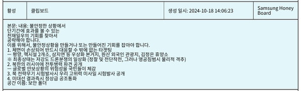 特検チームはヨ前司令官の携帯電話のメモを根拠として、昨年10月から11月にかけて断行された無人機作戦は戒厳宣布の大義名分を確保するためのものだったと判断した。特検チームが公開したヨ前司令官の携帯電話のメモには、昨年10月18日午後2時6分「不安定な状況で短期間に効果の上がる千載一遇の機会を探して攻略しなければならない」、その方策として「面目がつぶれて絶対に対応せざるを得ないターゲティング」などとある。標的としては、平壌▽核施設2カ所▽三池淵(サムジヨン)などの偶像化の本拠地▽元山(ウォンサン)外国人観光地▽金正恩(キム・ジョンウン)の休養所などが記されており、メモの下段には「最終状態は低強度のドローン紛争の日常化」と記載されている。非常戒厳宣布に先立ち、平壌などを標的として無人機を侵入させ、北朝鮮の対応を引き出すべきだ、と読み取れる内容だ。