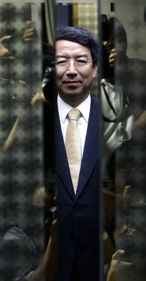 ←チョン・ウンチャン国務総理が29日午後、ソウル、世宗路の政府中央庁舎で辞退意思を明らかにする記者会見を行った後、エレベータに乗り執務室に戻っている。門が閉まる瞬間、エレベータ門にチョン総理を取材する報道陣の姿が映っている。 キム・ミョンジン記者 littleprince@hani.co.kr