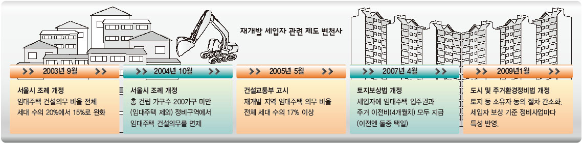 摩擦が起きるのが常だ。ニュータウンをはじめとする大部分の再開発地域で借家人を保護するための手続きがまともに守られないまま事業が強行されていると専門家たちは指摘する。イ・ウンジョン委員長は「再開発過程で借家人は住民供覧の時だけ参加できるとして、住居移転費を縮小したり支給を先送りする行為,引越し費用を与えない行為などを知る方法がない」と話した。住民供覧の場合にも、二ヶ所以上の日刊紙に公告したり原住民全数調査を通じて意見を集約するべきなのに事実上有名無実だという指摘だ。