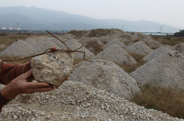 この日、梁山1地区生態公園造成工事現場には廃コンクリートが大量に数十山積まれており、一部の廃コンクリートはすでに地下に敷き詰め固められていた。土中に敷きつめた廃コンクリートには盛土用に使えない錆のついた針金やプラスチック、ビニールなどの異質物が混じっていた。