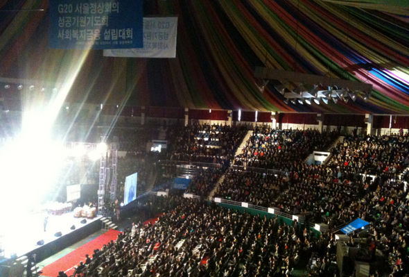 1日ソウル、中区、奨忠体育館。朝から集まった新教信者らは午前10時頃、8000人余りに増えた。新聞広告等を通じて公示された行事の名前は‘キリスト教社会福祉銀行設立発起人大会’だったが、現場に張り出された横断幕には‘主要20ヶ国(G20)ソウル首脳会議成功祈願祈祷会および韓国社会福祉金融設立大会’だった。行事は3時間ほどにわたり進行された。