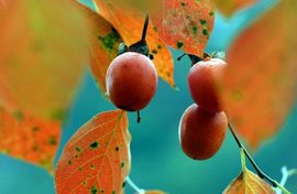 ←青い秋空の下の柿の木