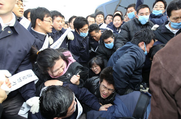 現代車非正規職労働者と民主労総など労働・社会団体会員たちが30日午後、ソウル、瑞草区、良才洞の現代起亜自動車社屋前で‘間接雇用撤廃と非正規職労働者の正規職転換’を要求し、車道で記者会見をした後、建物角の歩道で座り込みをしようとしたが、現代車職員らと用役らに押し出されている。この日、現代起亜自動車会社側は車両で正門を塞ぎ、職員を動員し建物内外を取り囲み集会を妨げた。 イ・ジョングン記者 root2@hani.co.kr