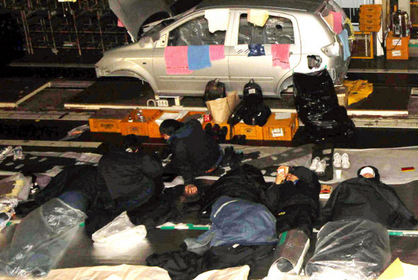 ←現代自動車非正規職労働者らが6日午前、電気と水道が止められた蔚山北区、楊亭洞の現代自動車第1工場2階の籠城場で背を丸くして寝ている。会社が籠城場へ向かうすべての出入口を封鎖し海苔巻き一本で一日を持ちこたえている。 蔚山/イ・ジョンチャン先任記者 rhee@hani.co.kr