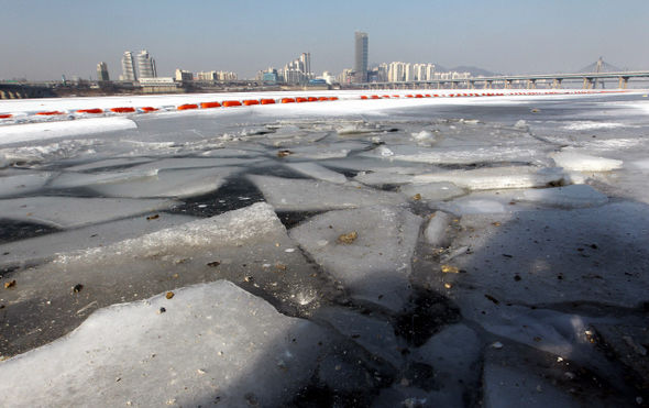 連日続く寒波で今冬に入り初めて漢江の結氷が公式観測された2日午後、ソウル、蚕室船着き場付近の漢江に氷片が浮いている。公式的な漢江結氷は‘第1漢江橋(漢江大橋)南端二番目と四番目の橋脚上流100m付近で川の水が完全に見えないまでに凍った時’を基準とする。キム・ギョンホ記者 jijae@hani.co.kr