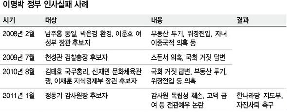 大統領府は2009年7月、チョン・ソングァン検察総長候補者の落馬の際、首席級人事企画官を新設したが、ずっと空席のまま、結局この年末に廃止した。 昨年8月キム・テホ、シン・ジェミン、イ・ジェフン候補者の落馬後には自己検証書の項目を200個に増やし、大統領府内模擬聴聞会制度も導入した。 しかし今回の‘チョン・ドンギ事態’に見るように、状況はより一層悪化している。