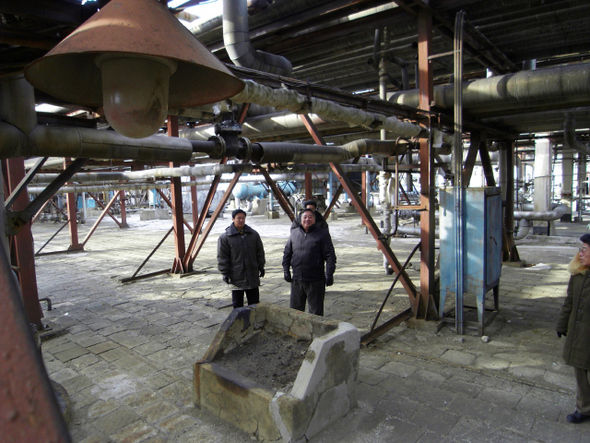 ←北韓の茂山鉄鉱と羅先特区に20億ドルを投資することにした中国 商地冠群投資有限公司のミチャン総経理(右側)が昨年12月末、羅先特区の勝利化学工場を見て回っている。商地冠群関係者を通じて<ハンギョレ>が入手した写真だ。