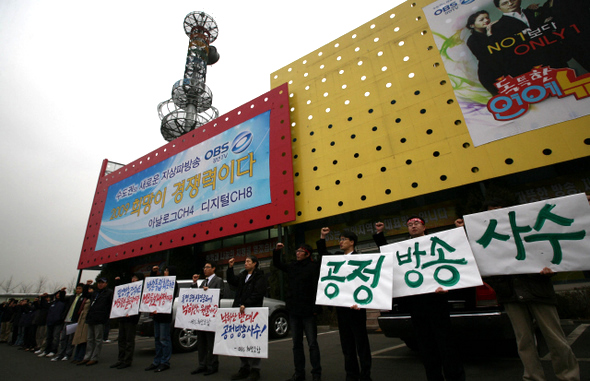 ←全国言論労組<OBS>支部労組員たちが12日午後、株主総会が開かれている京畿,富川市,梧亭洞の本社前でイ・ミョンバク大統領の放送特報を務めたチャ・ヨンギュ前<蔚山放送>社長の社長選任に反対する人間の帯デモを行っている。 富川/イ・ジョングン記者root2@hani.co.kr
