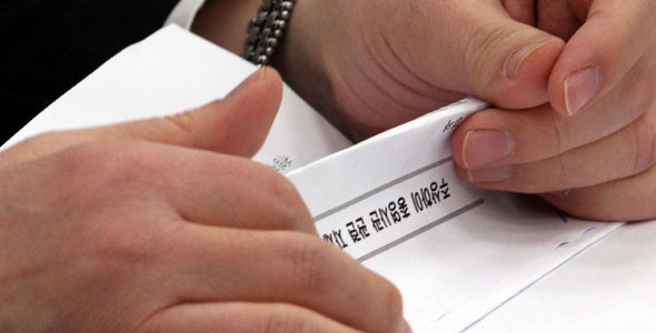 ←写真を撮られるかと心配し畳んだまま…キム・ソンファン外交通商部長官が9日午前、国会外交通商委員会で‘駐上海総領事館関連自主監査結果中間報告書’が言論に露出することを防ぐため報告書をたたんだまま報告している。 キム・ギョンホ記者 jijae@hani.co.kr