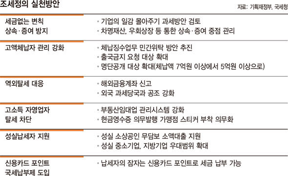 企画財政部はまず、高額滞納者名簿公開対象を現行の7億ウォン以上から5億ウォン以上にすることにし、公開方式も官報掲載にとどまらずインターネットなどに上げることにした。地方税滞納者名簿の公開対象も従来の1億ウォン以上3019人から3000万ウォン以上 3万3000人に増える。高額滞納者に対しては出国禁止要請対象も拡大する計画だ。公益法人が相続・贈与税の回避手段として悪用されないようにするため事後管理も強化される。