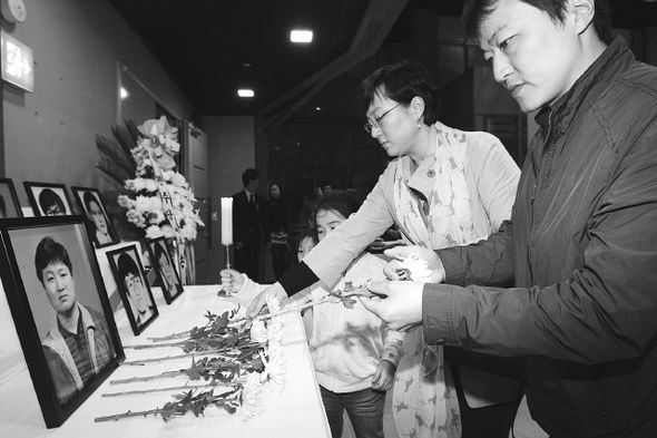 ←‘カン・ギョンデ烈士 20周忌追慕祭’が26日夕 ソウル、西大門区、南加佐洞の明智大国際会議場で開かれ参加者が行事場所に用意された追慕台に献花している。キム・テヒョン記者 xogud555@hani.co.kr