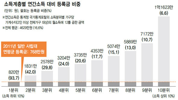 <ハンギョレ>が1日、教育科学技術部が去る4月に発表した2011年私立大学平均授業料(768万6000ウォン)と統計庁国家統計ポータルが公開した全国2人以上世帯の今年1分期(1~3月)月平均所得を年間所得に換算し比べてみたところ、所得最下位10%は年間所得が820万1352ウォンであるため授業料が所得に占める比重が93.7%にもなった。去年と同じ時期(91.2%)より負担が2.5%増えた。