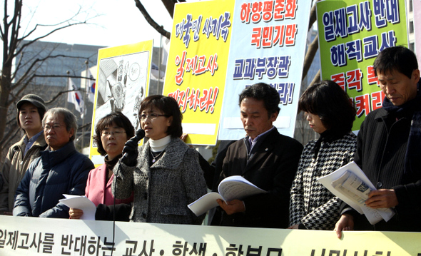 ←一斉試験に反対する教師・学生・父母・市民団体会員たちが23日ソウル,世宗路,政府中央庁舎正門前で‘学業達成度評価無効化’等を要求している。 シン・ソヨン記者viator@hani.co.kr