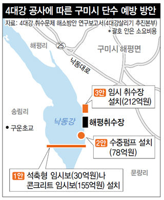 報告書は「海平取水場で取水に支障が生じる場合、住民たちと亀尾産業団地に大きな被害が予想される」として「中断なき用水供給のために水位確保のための施設を作るなり臨時取水場を建設しなければならない」と指摘していた。報告書は△取水場のすぐ脇に臨時堰(石築型臨時堰 30億ウォン、コンクリート堰 155億ウォン)を積み、水を堰き止め水位を高める方案△水中ポンプ(78億ウォン)で川の水を引いてくる方案△既存取水場のそばに臨時取水場(212億ウォン)を建設する3種類の対策を提示していた。