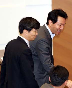←無償給食を巡る市議会との葛藤で議会出席を拒否してきたオ・セフン ソウル市長が20日午後、6ヶ月ぶりに第231回ソウル市議会定例会に参加するためクァク・ノヒョン教育長と同時に入場している。 キム・テヒョン記者 xogud555@hani.co.kr