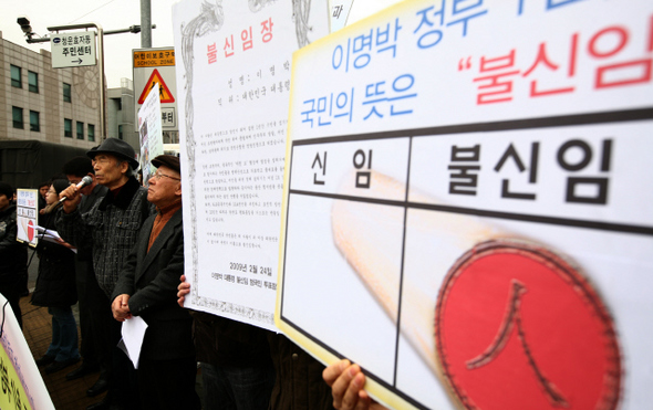 ←‘反米反イ・ミョンバク運動本部’会員たちが24日午前ソウル,鍾路区,清雲洞の大統領府入り口でイ・ミョンバク大統領に対する信任投票結果を公開している。これらは「全国71投票所とインターネット等を通じて2週間に計14万5594人余りが投票に参加した」として「開票結果96.78%である14万909人が‘不信任’,4487人が‘信任’を各々選択し、198人は無効票と集計された」と明らかにした。 イ・ジョングン記者root2@hani.co.kr