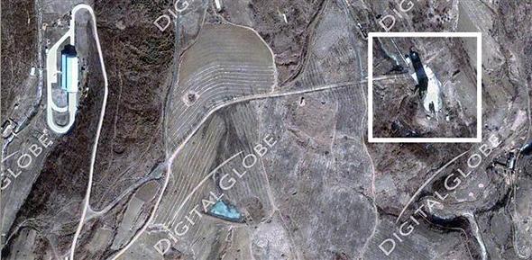 ←ムスダン里 ミサイル発射台。世界的な軍事コンサルティング企業であるジェインス グループが発行する軍事専門紙<ジェインス ディフェンス ウィークリー>が公開した咸鏡北道,ムスダン里のミサイル発射台の姿(白線内)。ミサイル発射作業に動員される補助運送機構とトラック数台が現場に到着している。 <ジェインス ディフェンス ウィークリー>は米国の商業衛星写真業者デジタルグローブから去る18日受け取った写真を分析した結果、遠隔計測器とレーダー設置作業情況が捉えらており、ミサイル発射台とエンジンテスト施設付近での活動も最近相当に増加していると説明した。 デジタルグローブ提供連合