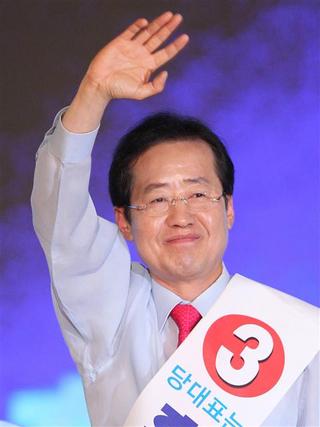 ホン代表は受諾演説で「ハンナラ党は真の保守政党として新たに出なければならない」とし「今からハンナラ党改革を始める」と話した。ホン代表は‘選挙人団投票+世論調査30%’を合算した有効投票の25.5%にあたる4万1666票を得て1位を占めた。