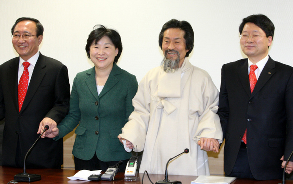 二党は最初の会議の後、スポークスマン ブリーフィングを通じて「イ・ミョンバク政権独走に対抗して4・29再補欠選挙で進歩陣営の候補単一化を成し遂げることにした」として単一化意志をまた固めた。また議論を進展させるために「まず来月2日に二党間実務協議を行い、候補単一化方法などを定めるために近い将来、民主労働党と進歩新党,市民社会勢力などを含む円卓会議を構成をすることにした」と明らかにした。ウ・ウィヨン民主労働党スポークスマンは「希望の持てる席になった」として「候補単一化は4月補欠選地域に含まれると予想される蔚山北区を含んだ補欠選地域全体を意味する」と話した。ただしウ スポークスマンは「民主党との単一化の話まで出てくることはなかった」と伝えた。議論に先立ちカン・キガプ代表は「反MB勢力の大団結を作る契機になるように願う」として単一化議論が水面上に上がってきたことに対する期待を表わした。シム・サンジョン共同代表も「国民は補欠選で進歩政治勢力が力を合わせ苦痛を受けている人々に希望を与えることを願う」とうなずいた。 ソン・ホジン記者dmzsong@hani.co.kr